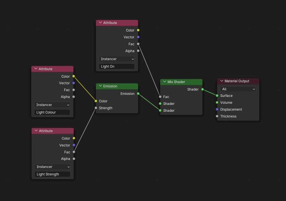 It's fairly simple, but just to give some minor explanation, as I had a question about it after sharing the video, the turning on and off of the light is done by mixing between the emission shader and an empty input, which will default to black.